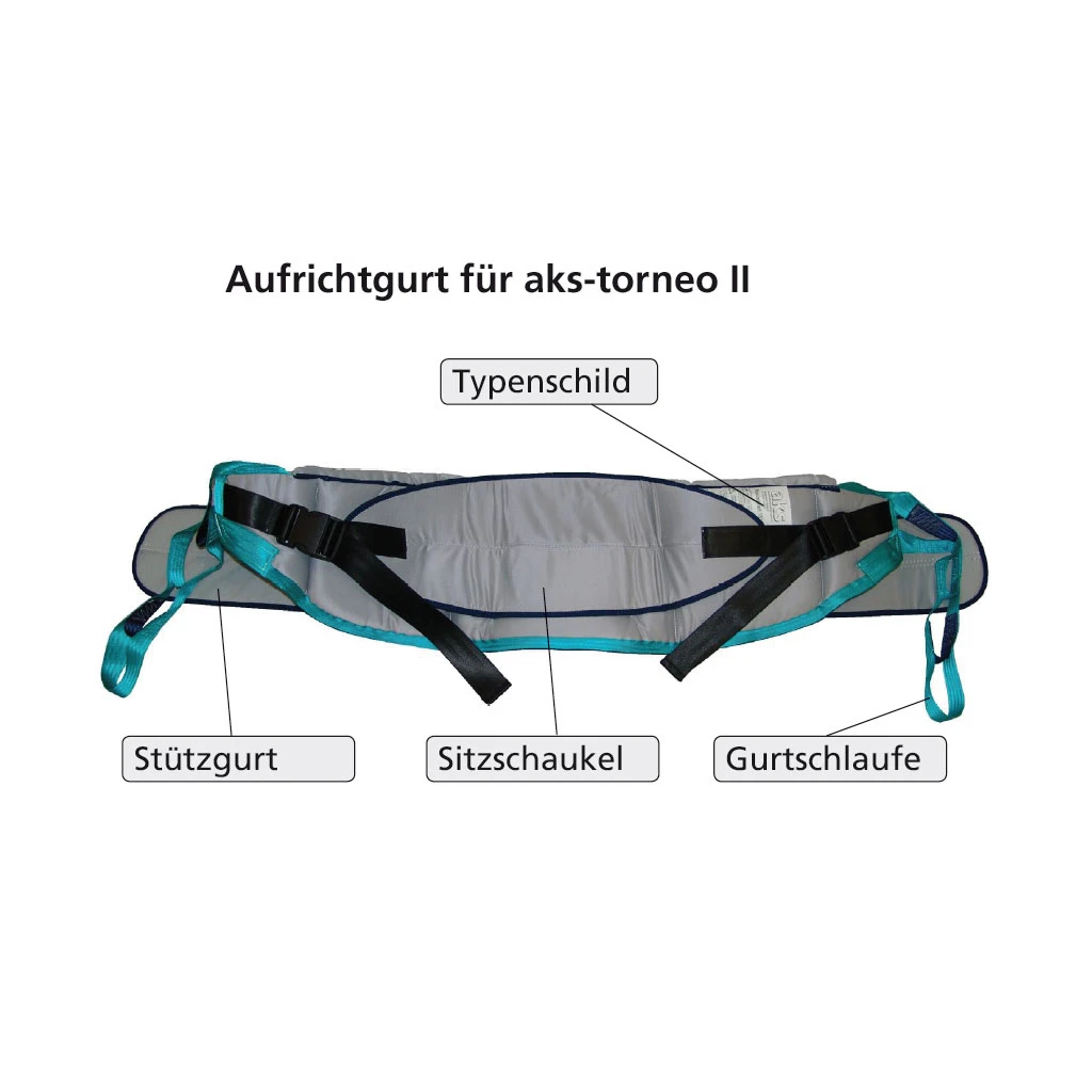 Um einen Patienten mit dem aks‑torneo II & aks-torneo compact aufzurichten, benötigen Sie den zur Patientenstatur passenden aks‑Aufrichtgurt.
