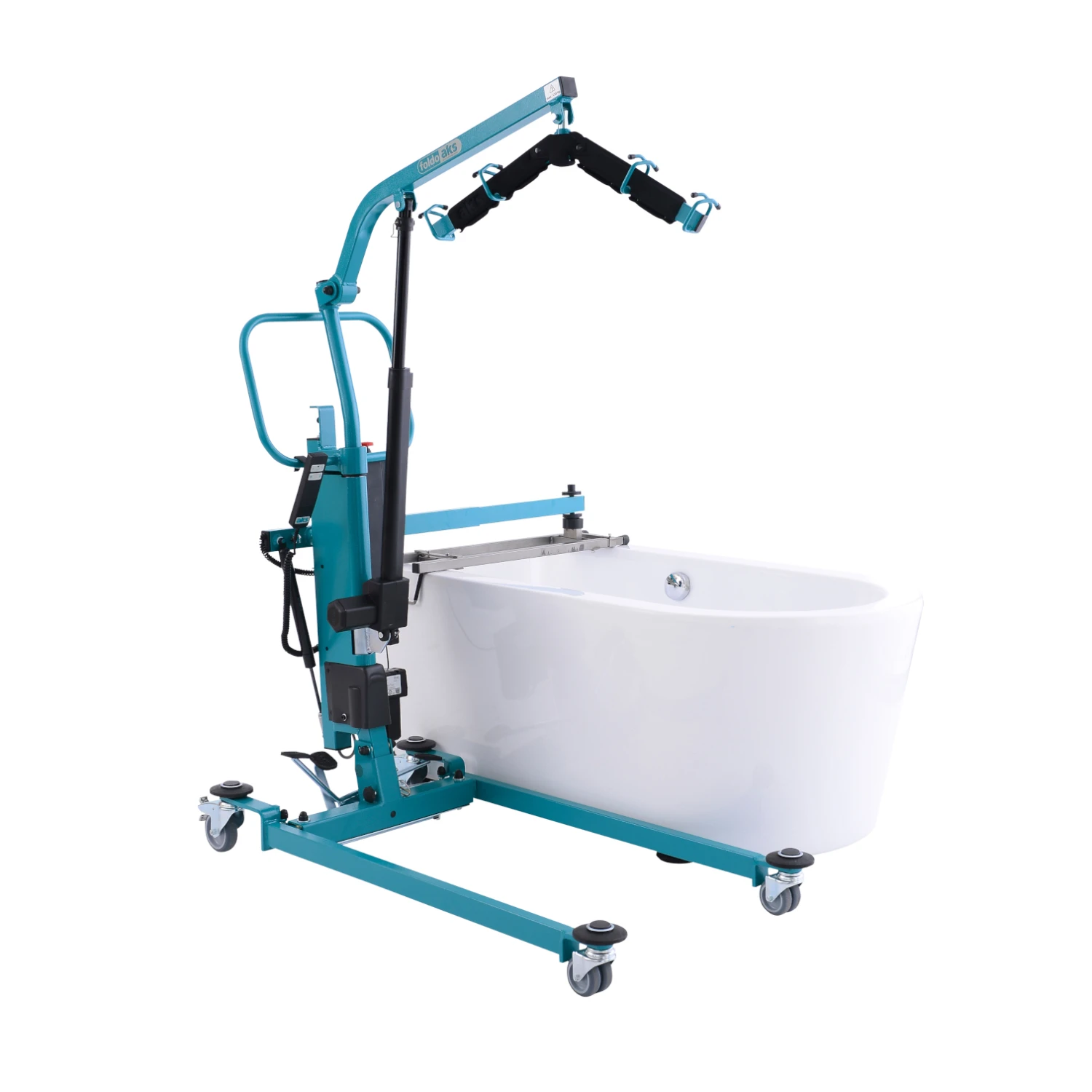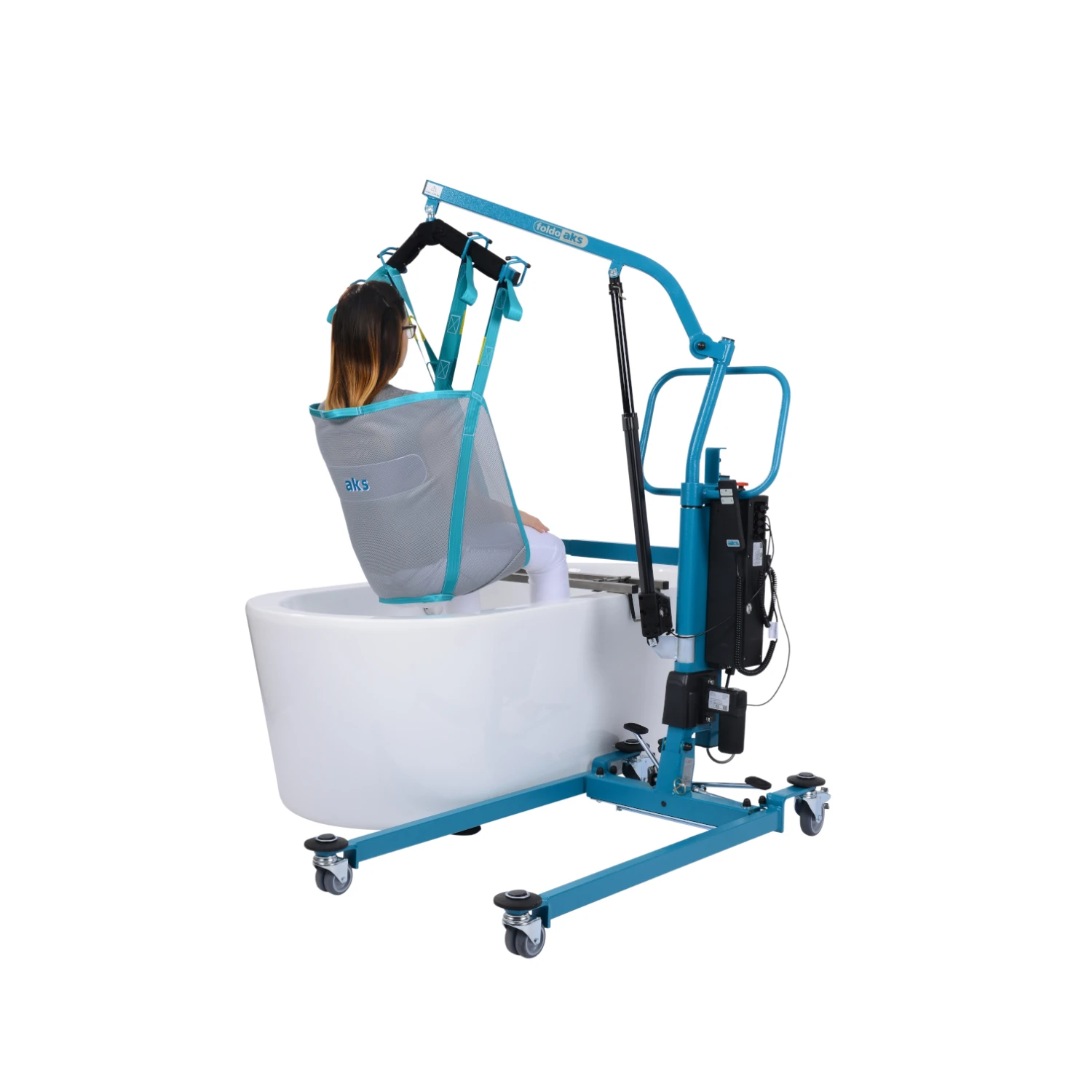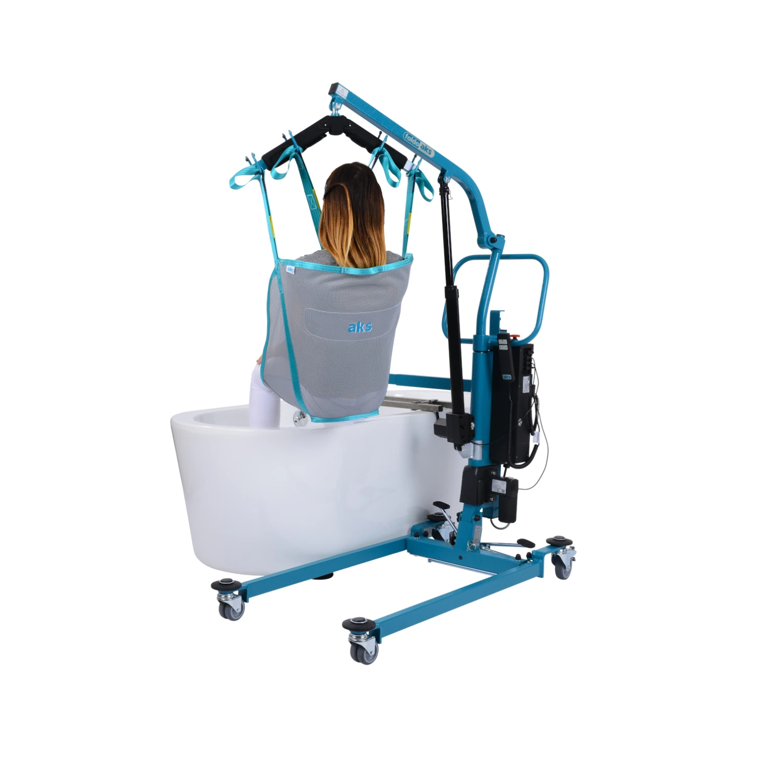 - Neben den Standardfunktionen eines Lifters (Heben, Transferieren und Umsetzen einer Person) ist der AKS Foldo durch die stabile Schwenkfunktion zusätzlich im Badbereich einsetzbar.