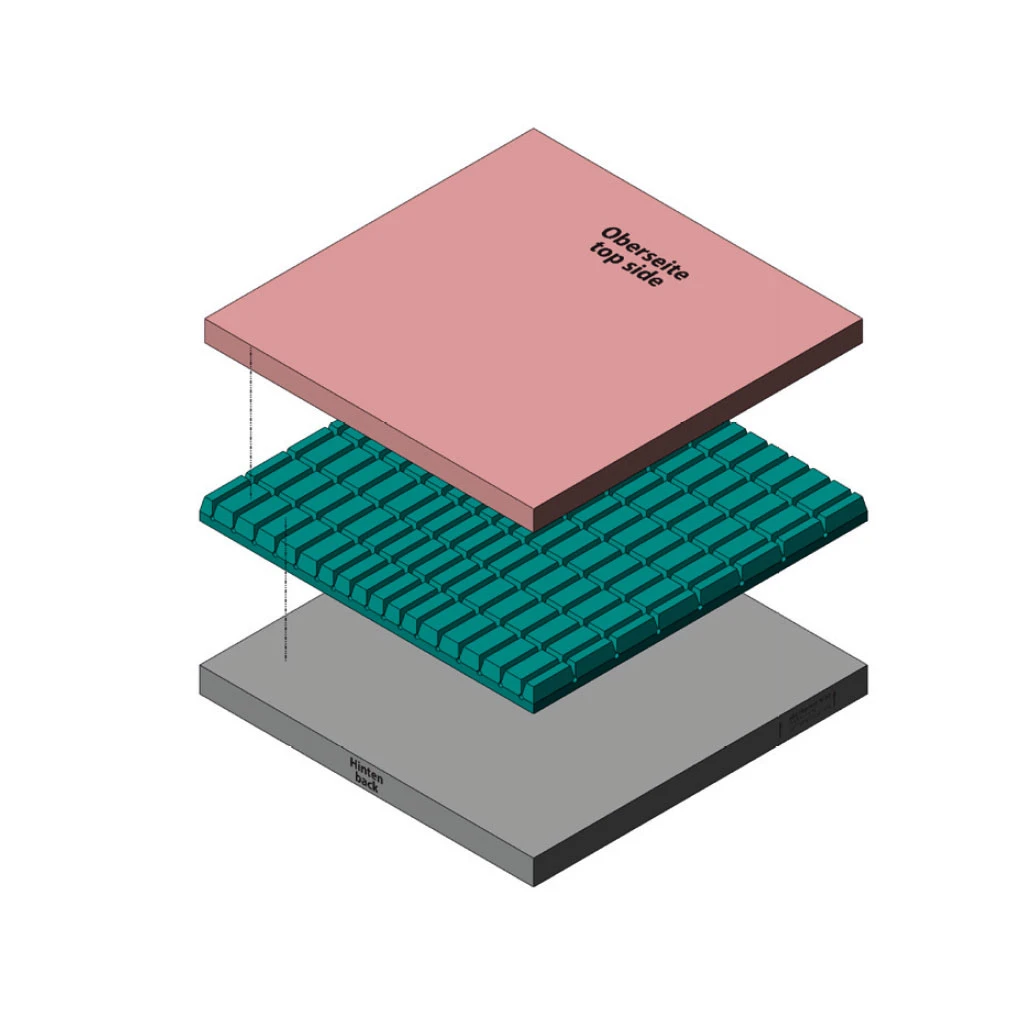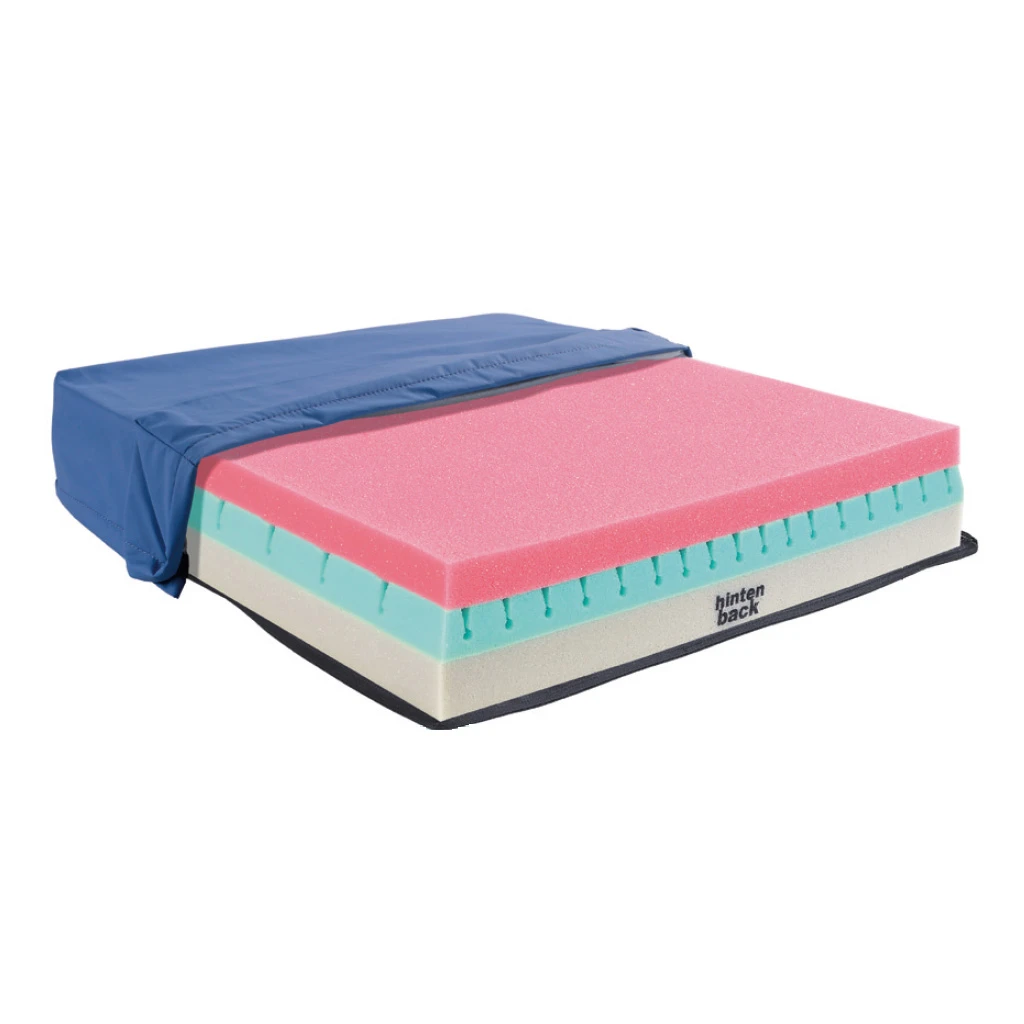 - Dreischichtiges Schaumstoff-Sitzkissen mit anspruchsvollen würfelförmigen Einschnitten in der mittleren Schicht für eine gute Druckentlastung und zur Scherkraftminderung