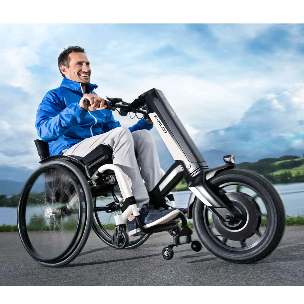 Das neue Zuggerät e-pilot macht deinen Rollstuhl in Sekundenschnelle zu einem sportlichen Fahrzeug. - Einfach den e-pilot mit wenigen Handgriffen an deinen Rollstuhl andocken und du hast die dynamische Kombination für den Alltag.