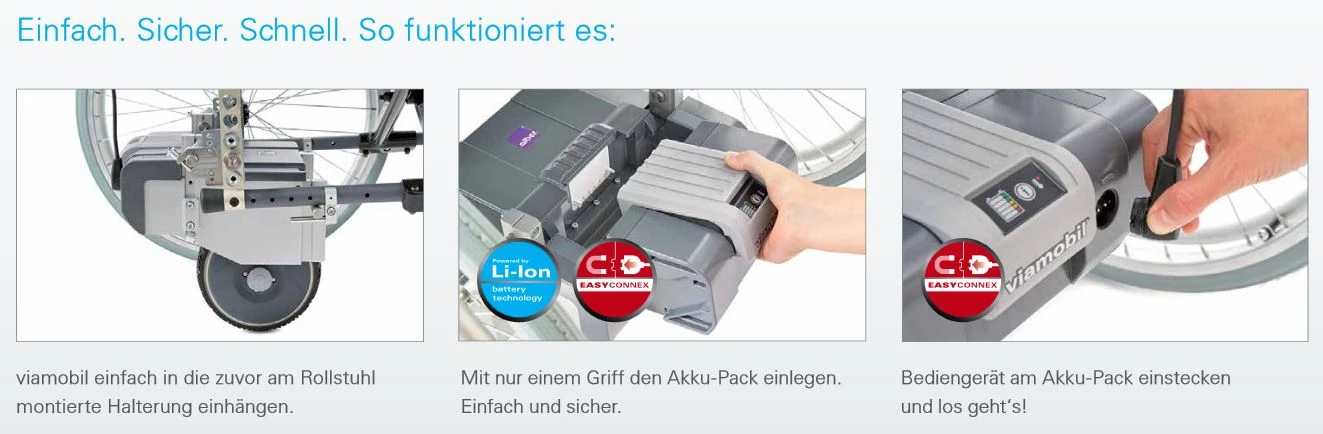 - Die Idee hinter viamobil ist so einfach wie clever: Ein elektrischer Zusatzantrieb wird nachträglich an Ihren vorhandenen Rollstuhl angebracht.