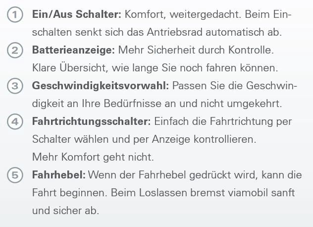 - Der starke Elektromotor entlastet die Begleitperson und verleiht so Ihrer Mobilität neuen Antrieb. Mit viamobil wird das Schieben, aber auch das Bremsen kinderleicht.