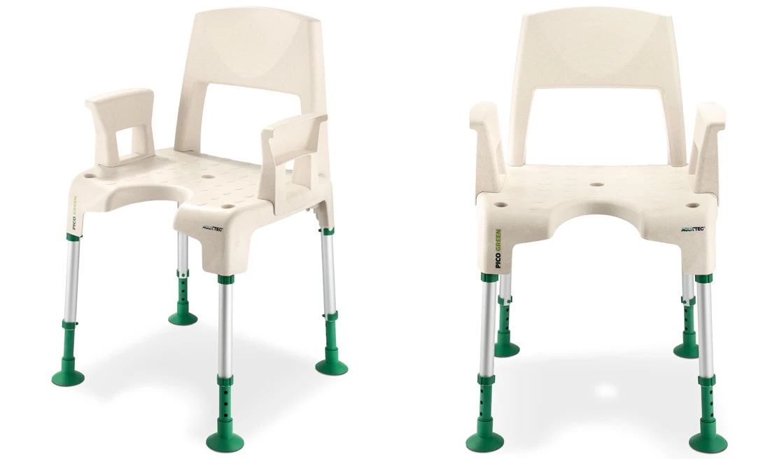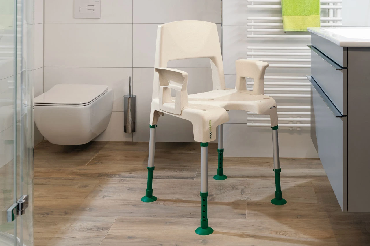 - Der Duschstuhl Pico Green basiert auf sehr feinen, nachhaltig produzierten Holzfasern aus heimischen Wäldern.