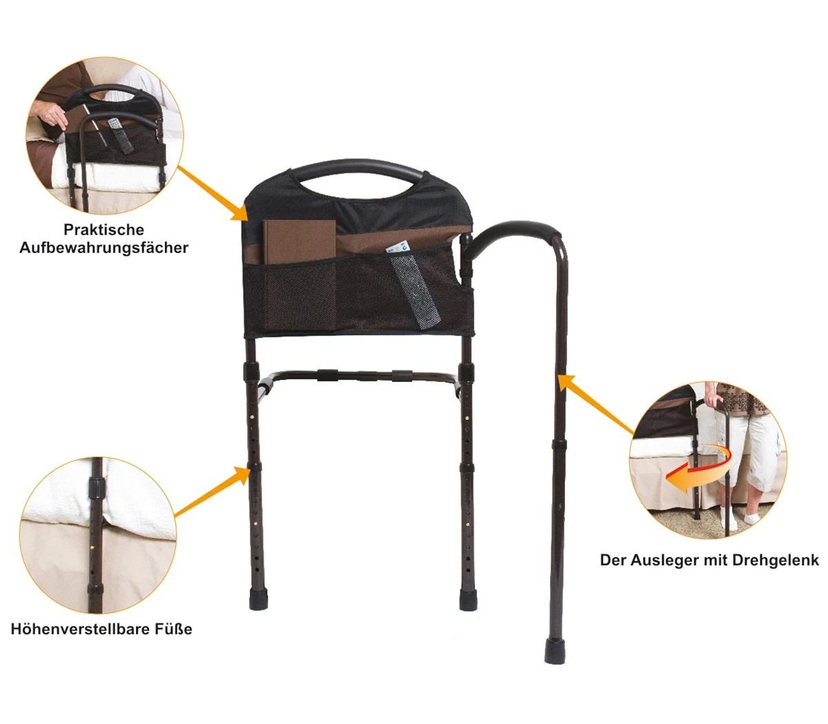 - Durch seine höhenverstellbaren Standbeine kann der Bettgriff an jedes Standard- oder Pflegebett angepasst werden (nur für rahmenlose Betten geeignet).