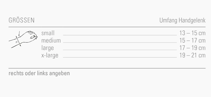 - Eine anpassbare volare Schiene und das Stabilo®-Band, welches individuell dosiert angelegt werden kann, bieten eine sichere Stabilisierung des Handgelenks
