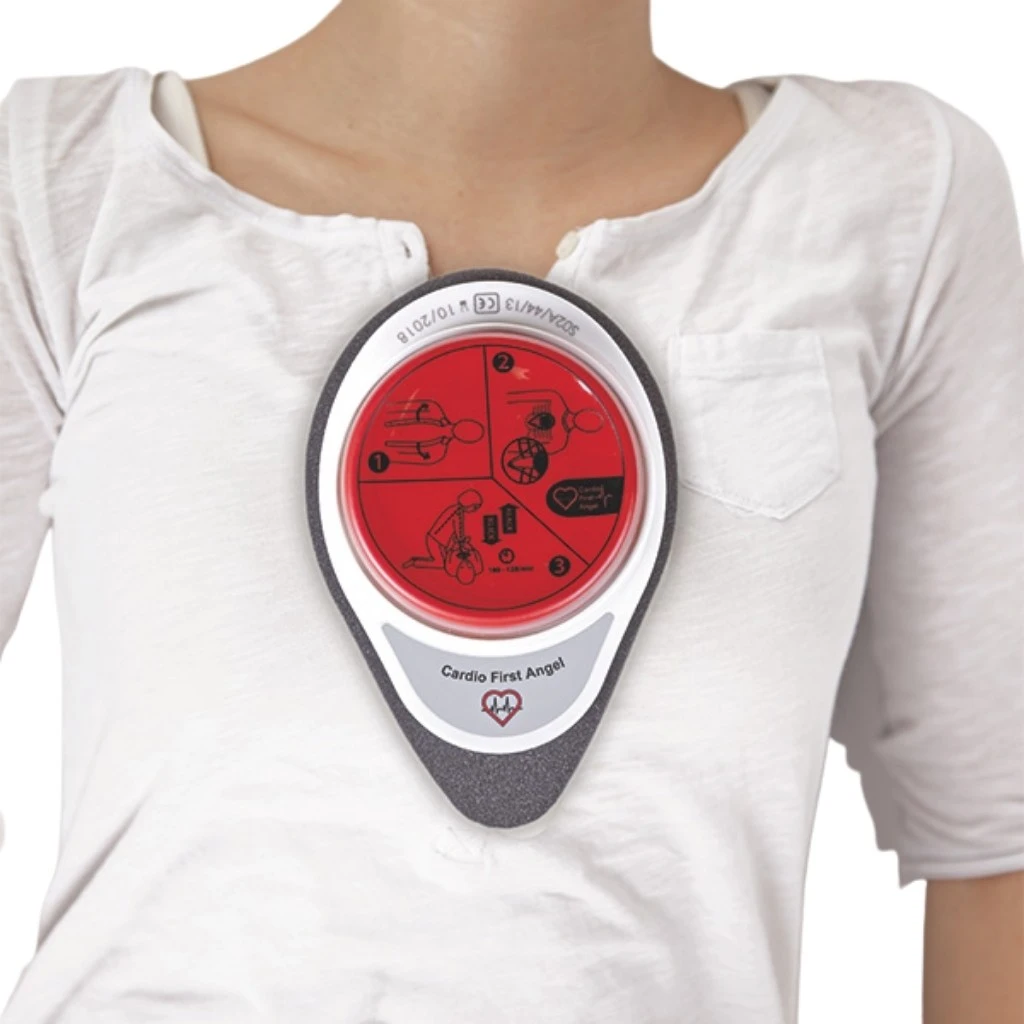 - Viele Ersthelfer finden ohne Unterstützung nicht die richtige Stelle für eine Herzdruckmassage. Mit dem Cardio First Angel dagegen führt man die Massage automatisch dort durch, wo sie am wirkungsvollsten ist. Dafür sorgt eine Positionierungshilfe. Das Gerät wird in der Mitte der Brust aufgesetzt und eine Zeichnung auf der Oberfläche zeigt an, wie die Hand aufgelegt werden muss.