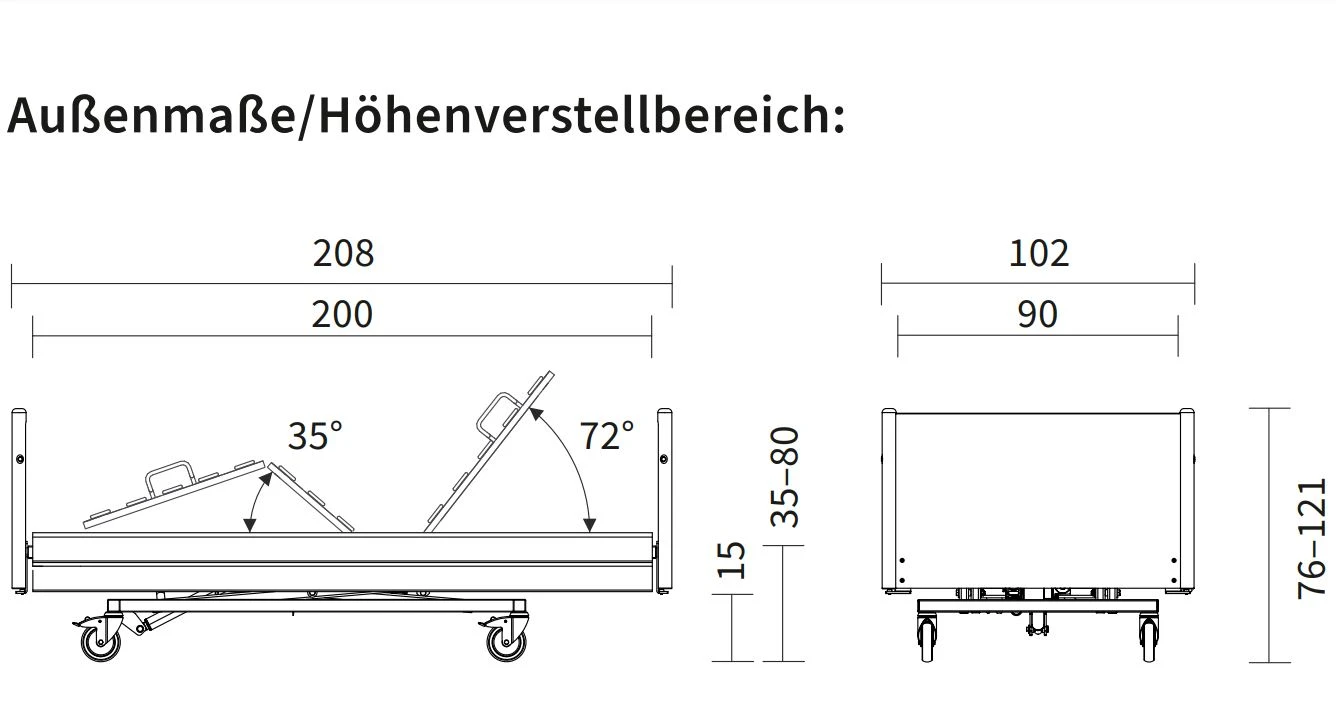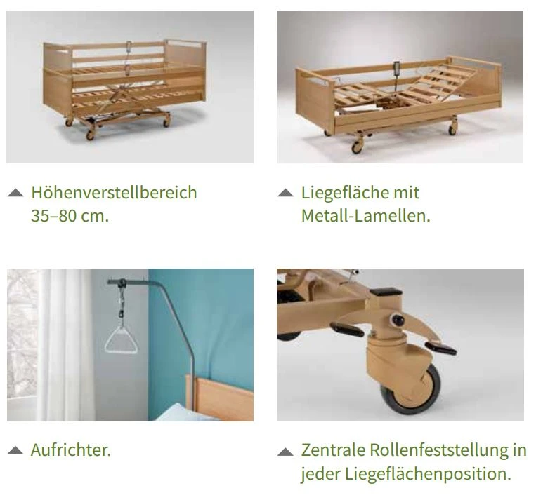 - Die 4-geteilte Metall-Liegefläche passt sich mit ihrer auswandernden Rückenlehne jederzeit der gewünschten Position des Bewohners an und folgt während der Verstellung seinem natürlichen Bewegungsablauf.