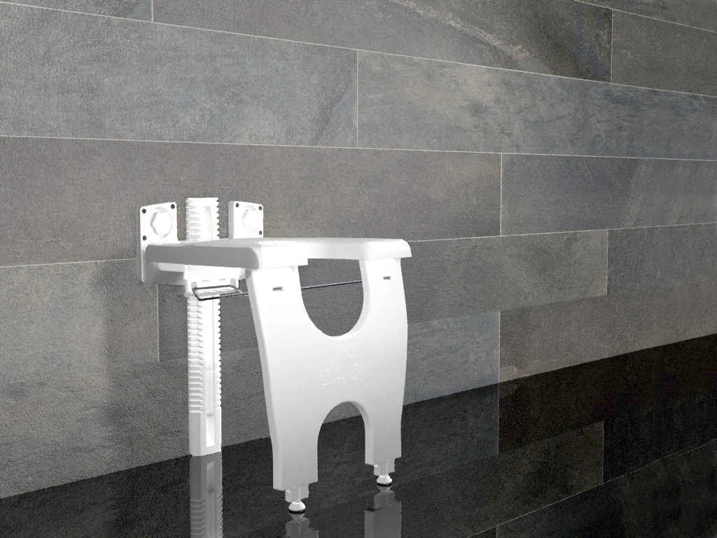 - Der varioporto Duschklappsitz wird einfach an die angeklebte Wandstütze fixiert und mittels Sternschrauben festgedreht.