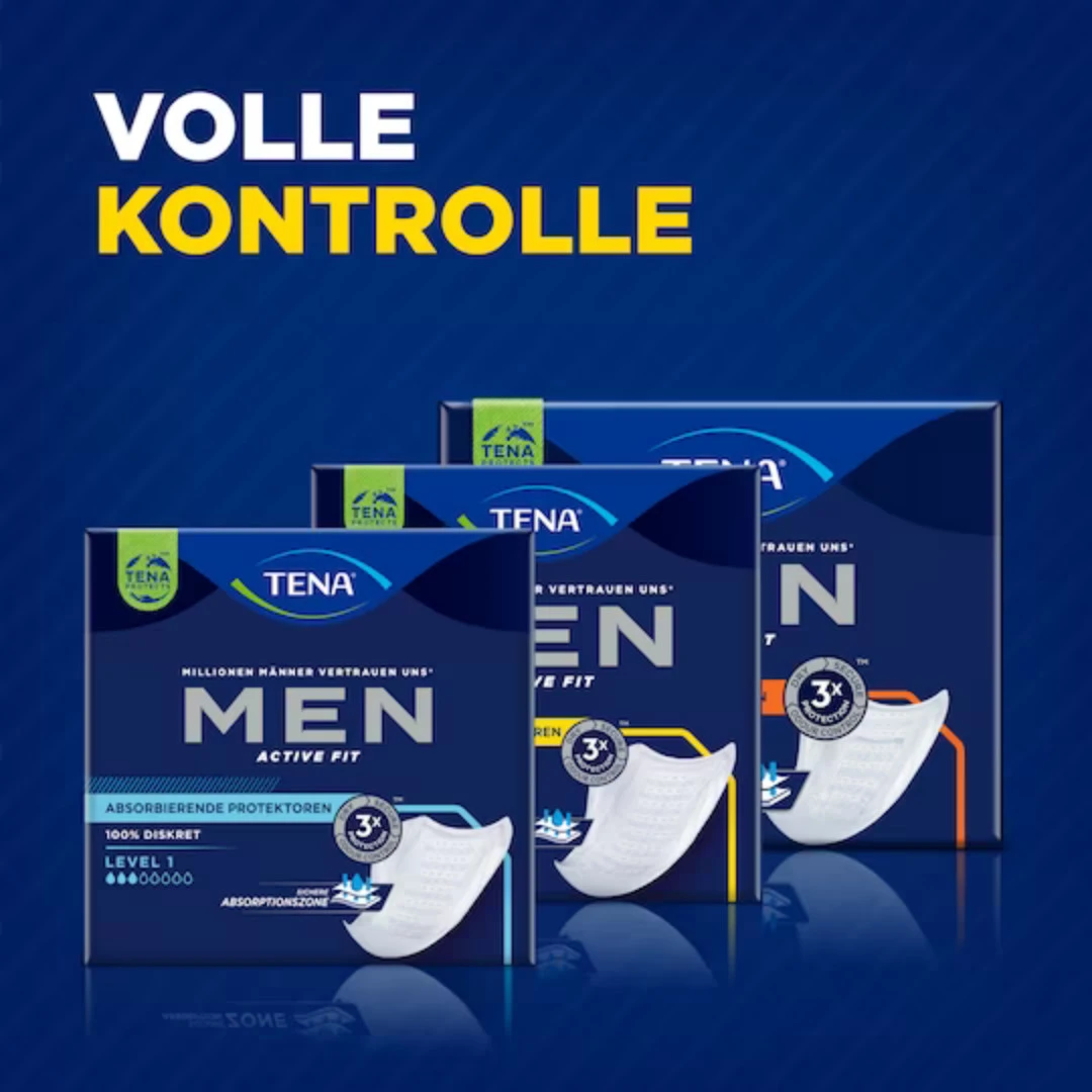 - TENA Men Active Fit Absorbierende Einlage Level 1 absorbiert leichtes Nachtröpfeln und schützt vor Auslaufen, Feuchtigkeit und Gerüchen.