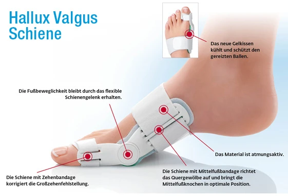 - Korrektur der Großzehenfehlstellung nicht nur in Ruhe sondern auch beim Gehen und Stehen