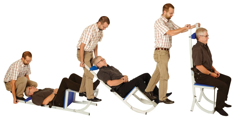 - Durch einfaches Anheben des HEBIX an den Griffen bringt man die liegende Person sanft und ohne Schmerzen in eine Sitzposition.