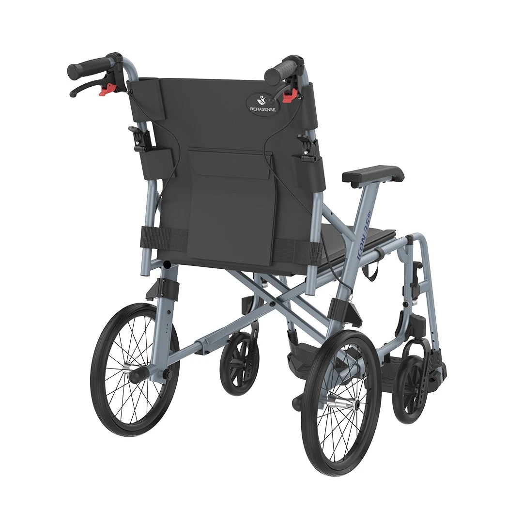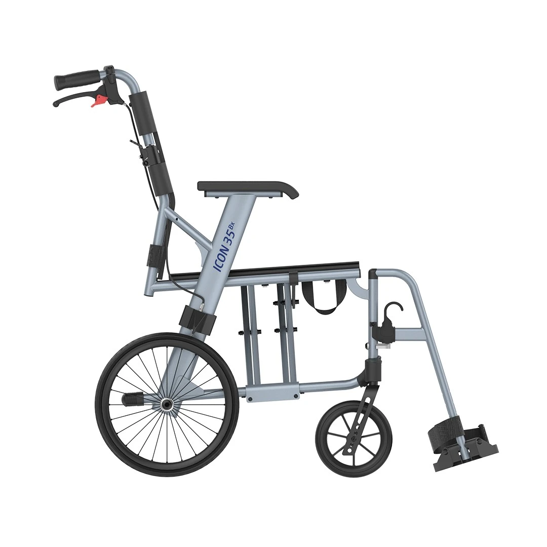 ICON 35 BX-45-22-AK, Leichtgewichts-Transportrollstuhl aus Aluminium, SB45cm, 14″-Räder, inkl. Druckbremse + Begleiterbremse, inkl. Kippschutz links+rechts, nur 8.2kg