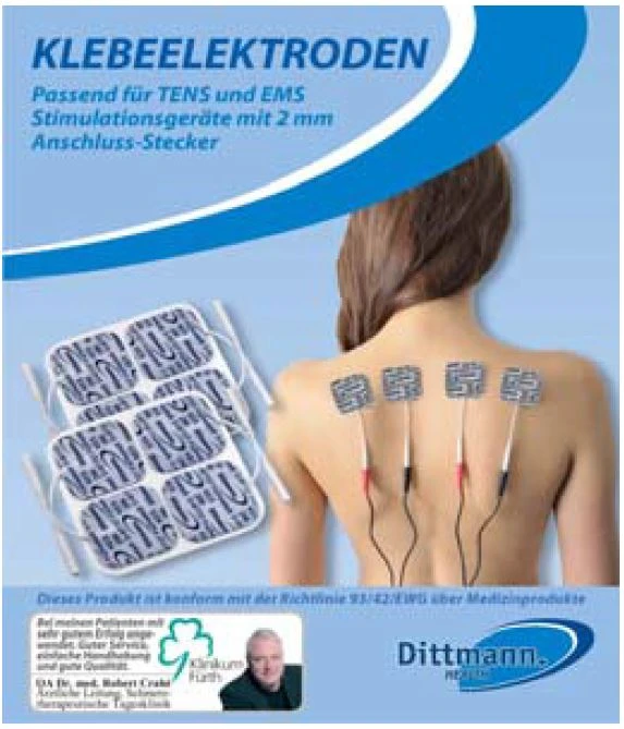 fließt von der positiven (+) Klebeelektrode (mit dem roten Stecker) zur negativen (-) Klebeelektrode (mit dem weißen Stecker). Durch dieses Verfahren wird bei einer angewendeten Schmerztherapie die Schmerzzuleitung zum Gehirn beeinflusst. Der Anwender nimmt den Schmerz nicht mehr oder nur noch vermindert wahr. Die Intensität der beiden Klebeelektroden ist abhängig von der Einstellung des jeweiligen Gerätes. Verfügt Ihr Gerät über zwei Kanäle, können pro Kanal zwei Elektroden angeschlossen werden.