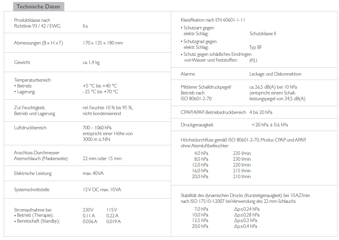 - CPAP-APAP-Therapiegerät zur Behandlung von Patienten mit obstruktiver Schlafapnoe mit variablem Druckbedarf (Der Therapiedruck passt sich während der Nacht automatisch an den Druckbedarf des Patienten an)