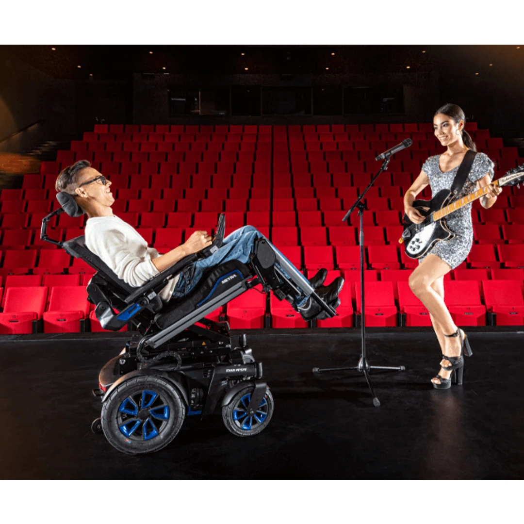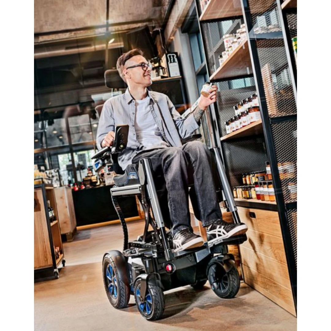 - Antriebsräder sind einzeln gefedert sowie von den Antriebsrädern losgelöste: Die Federung aller Räder (4fach Federung) verringern maßgeblich Erschütterungen auf die Wirbelsäule und den Rumpf des Nutzers.