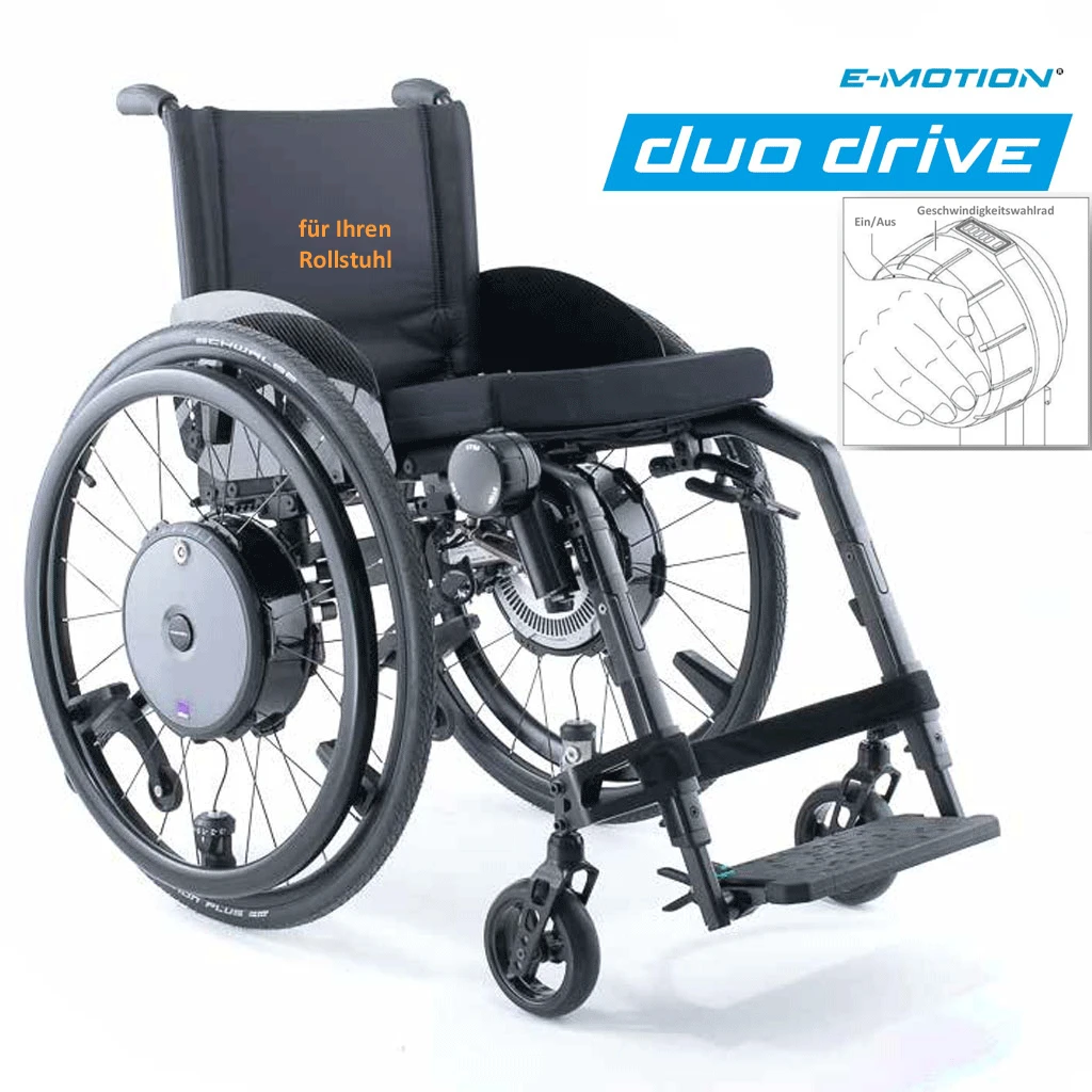- Der neue e-motion DuoDrive ist eine Marktneuheit und mit einem kabellosen Bediengerät ausgestattet, das an der Fußstütze des Rollstuhls montiert wird.