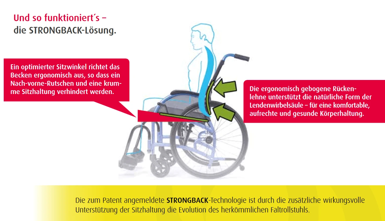 - Die patentierte STRONGBACK Technologie ist die Evolution des herkömmlichen Faltrollstuhls – durch die integrierte wirkungsvolle Unterstützung der Sitzhaltung.