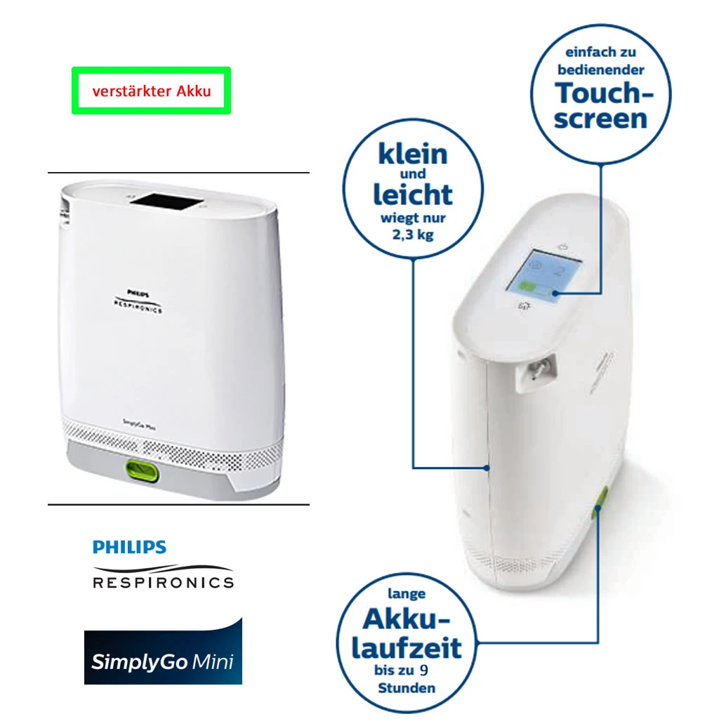 - SimplyGo Mini ist der kleinste und leichteste mobile Sauerstoffkonzentrator, der jemals von Philips Respironics entwickelt wurde, und ist dank seiner Funktionen optimal auf Patienten von heute angepasst