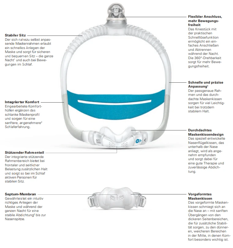 - Hohe Bewegungsfreiheit, mit dem an der Kopfoberseite angeschlossenem Schlauch der ResMed Nasenspitzenmaske