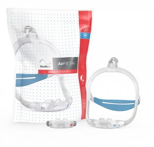 – Starter-Paket Small: 1 x ResMed AirFit P30i Nasenpolstermaske inkl. Kopfband, Maskenrahmen Small mit Komfortpolstern, Nasenpolsterkissen in S und M inkl. QuietAir-Ausatemöffnungen.