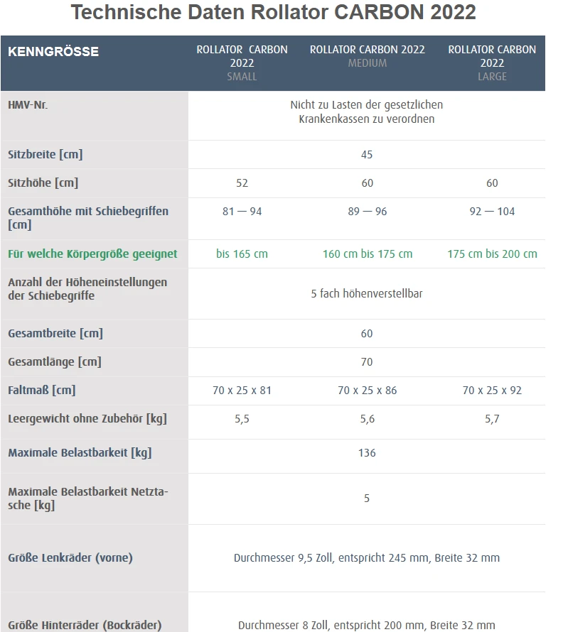 - Das Ziel bei der Entwicklung dieses Produktes war es, ein möglichst geringes Gewicht bei maximaler Stabilität zu erreichen. So kann der Rollator CARBON mit einem Gewicht von nur 5,5 kg (ohne Zubehör in der Größe S) aufwarten.