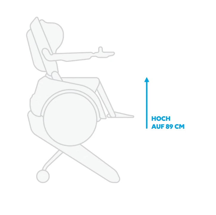 Der integrierte Sitzlift bietet eine breite Palette an Einsatzmöglichkeiten. Fährst Du ihn auf die niedrigste Sitzhöhe von 44cm nach unten, ist er ideal, um zu transferieren oder an unterschiedlichen Tischen Platz zu nehmen. Fährst Du ihn auf die maximale Sitzhöhe von 89cm hoch, nimmst Du mit Leichtigkeit Deine Lieblingskonfitüre aus dem obersten Regal oder beobachtest die Dinge aus der Fussgänger-Perspektive.