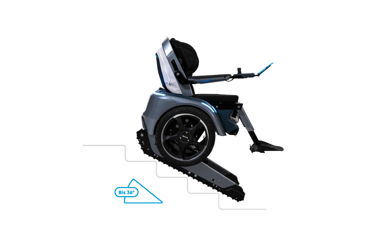 sowie leichte Steigungen elegant aus, und das auch ohne Rumpfstabilität des Fahrers. Wird es für den Fahrmodus des BRO zu steil, wechselst du auf die fest verbauten Raupen, um quasi die für Rollstühle bisher unbezwingbaren Steigungen zu meistern.