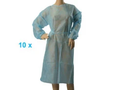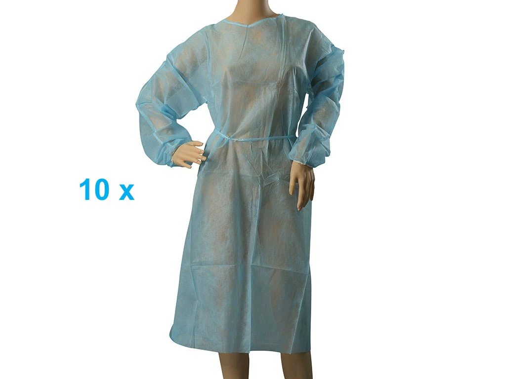 Schutzkittel aus PP, laminiert mit PE, mit elastischen Bündchen und Bändern am Hals zum Schutz vor Infektionen.