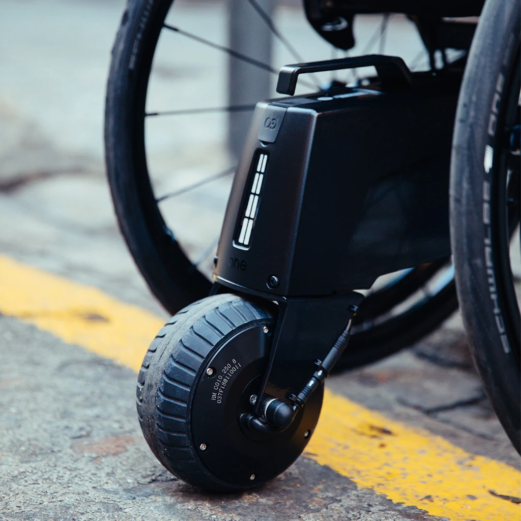 den innovativen Elektroantrieb in Sekunden an einem Aktiv-/Adaptivrollstühle montieren