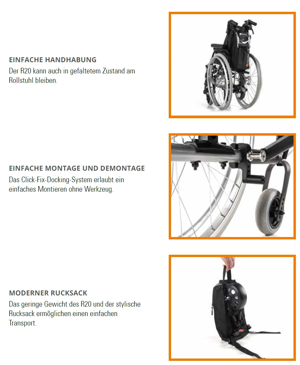 - Die Faltfunktion und das geringe Gewicht des R20 ermöglichen einen problemlosen Transport – auch am Rollstuhl montiert