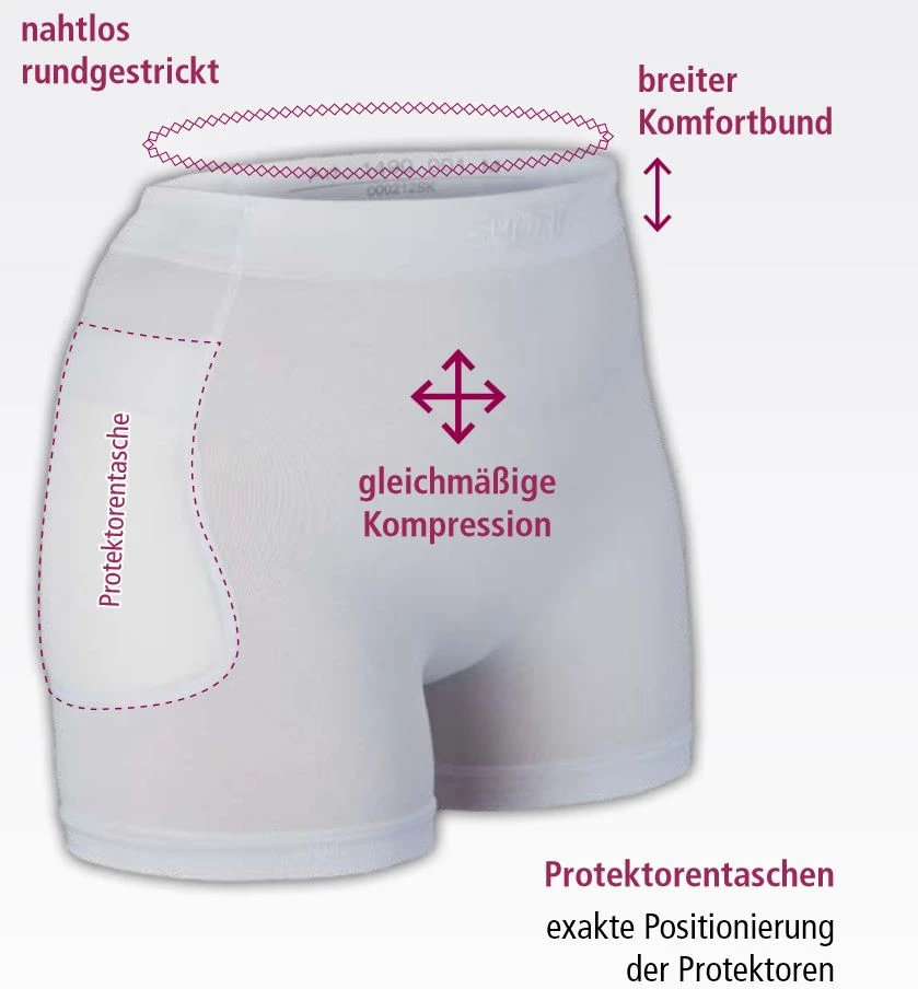 - Der Hüftprotektor-Slip ist aus einem Stück nahtlos rundgestrickt und dadurch äußerst langlebig. Durch den breiten Komfortbund ist der Slip angenehm zu tragen, und bietet durch die gleichmäßige Kompression ein hohes Sicherheitsgefühl.