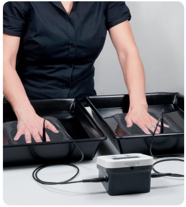 Die Iontophorese-Behandlung der Hyperhidrosis manum et pedum ist ein physikalische Anwendung. Sie wurde erstmals 1952 von Boumann und Grunewald-Lentzer beschrieben. Gleichstrom oder gepulster Gleichstrom bewirkt einen lonentransport durch die Haut.Die Kunststoffwannen werden ca. 3-4 cm hoch mit lauwarmen Leitungswasser gefüllt, so dass die Hand-oder Fußflächen vom Wasser bedeckt sind. Vor dem Füllen der Wannen müssen die Elektroden mit den Netzauflagen abgedeckt werden, um den unmittelbaren Hautkontakt zu vermeiden.