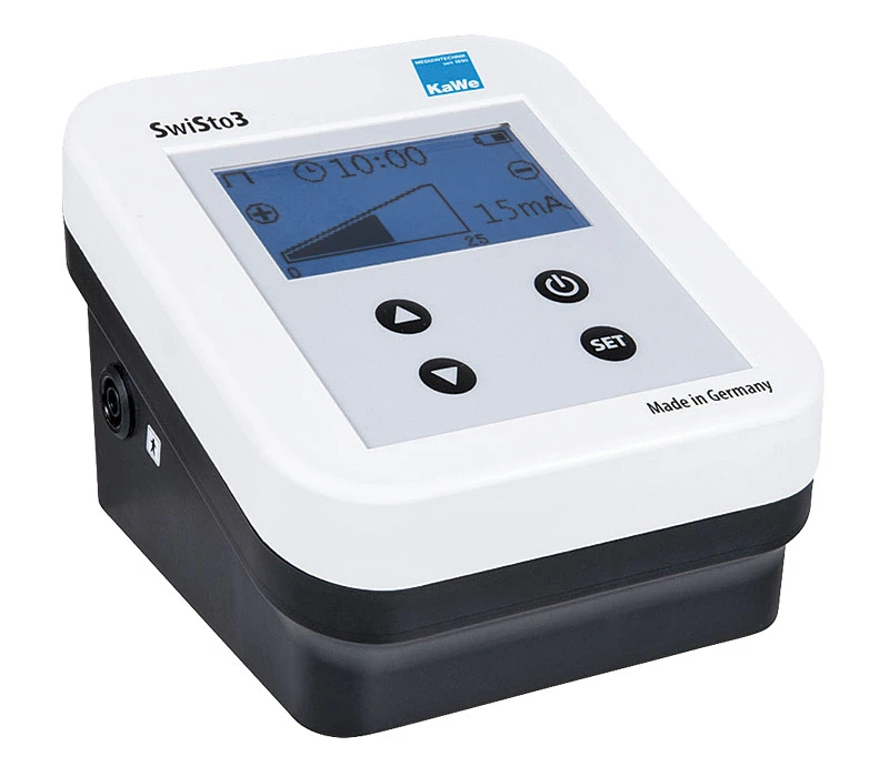 - Das neue SwiSto3 in modernem Design ist äußerst benutzerfreundlich und bietet Ihnen für die Behandlung der Hyperhidrosis zwei Möglichkeiten: Therapie mit Gleichstrom oder Therapie mit Pulsstrom, der besonders für empfindliche Patienten oder Kinder und Jugendliche geeignet ist.