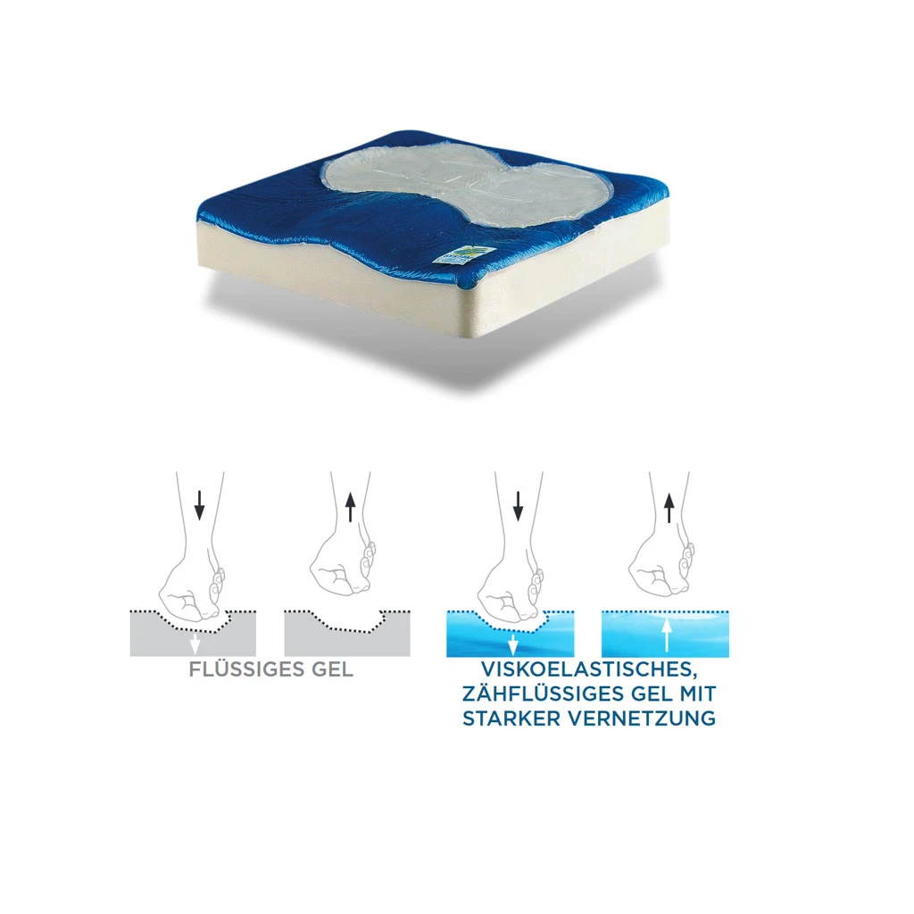 - Das Multitragfähigkeit mit einem flüssigen Gel der neuen Generation mit elastischem Verhalten ermöglicht eine bedeutsame Verminderung des am Sitzbein ausgeübten Druckes