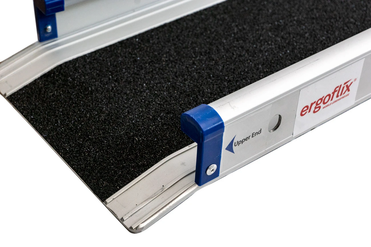 Mit Hilfe des 2-teiligen Rampenpaares können Sie Ihr ergoflix-Modell ganz bequem in fast jeden Kofferraum ein- und ausladen. Auch Treppenstufen sind mit dem Rampenset von ergoflix leicht zu überwinden. Die Teleskoprampen sind aus robustem Aluminium gefertigt und lassen sich leicht aus- und wieder einschieben. Dank geringem Gewicht und Schiebemechanismus ist so ein kompakter Transport gewährleistet.