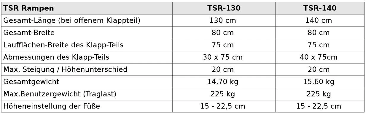 - Die TSR Rampen bestehen aus einem festliegendem Rampenteil und einem Klappteil und sind z.B. zur Überwindung von Türschwellen von Terrassen o.ä. gedacht.
