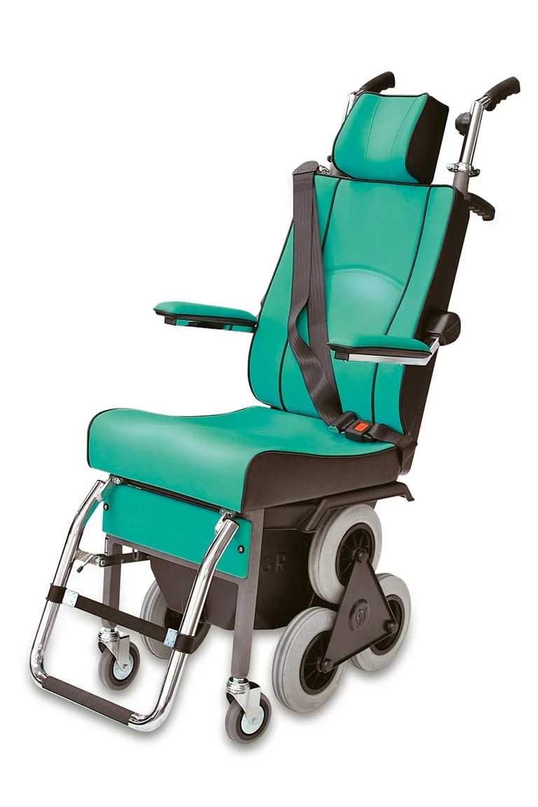 Der bequeme und anatomisch geformte Sitz ist fest auf die Steigeeinheit montiert und in zwei Breiten erhältlich, S (schmal) und L (breit). Die Bedienung erfolgt über eine Begleitperson. Unser Treppensteiger zeichnet sich durch eine besonders ruhige Steigungsbewegung aus, da die Aktion über ein Räderdreieck erfolgt.