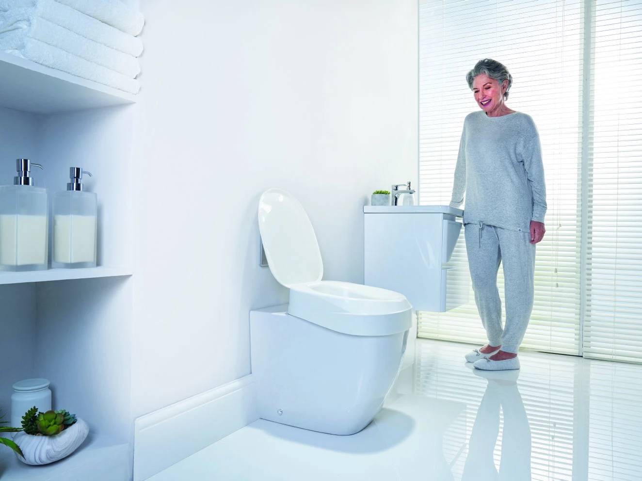 Die ergonomisch konturierte Sitzerhöhung für die Toilette bietet eine einfache Handhabung und sorgt für eine ergonomische Sitzhaltung. Sie punktet mit funktionalem, diskretem und modernem Design sowie einer werkzeuglosen Montage. Außerdem fördert der Toilettenaufsatz die Selbständigkeit bei der täglichen Hygiene, ohne die Ästhetik im Bad zu stören. Der schlichte Stil der Aquatec 90 Ergo fügt sich in jede Umgebung ein, ohne aufzufallen.
