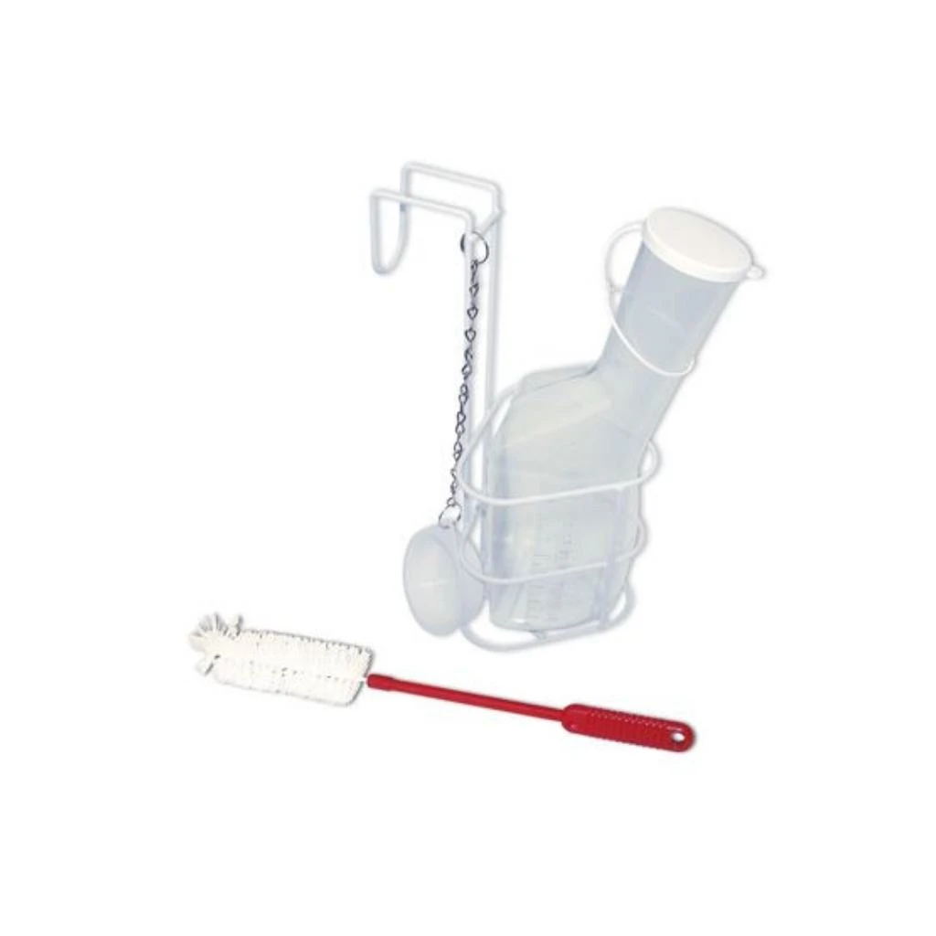 - Reinigung: Nach Entleerung mit heißem Wasser ausspülen und mit der Urinflaschenbürste gründlich reinigen